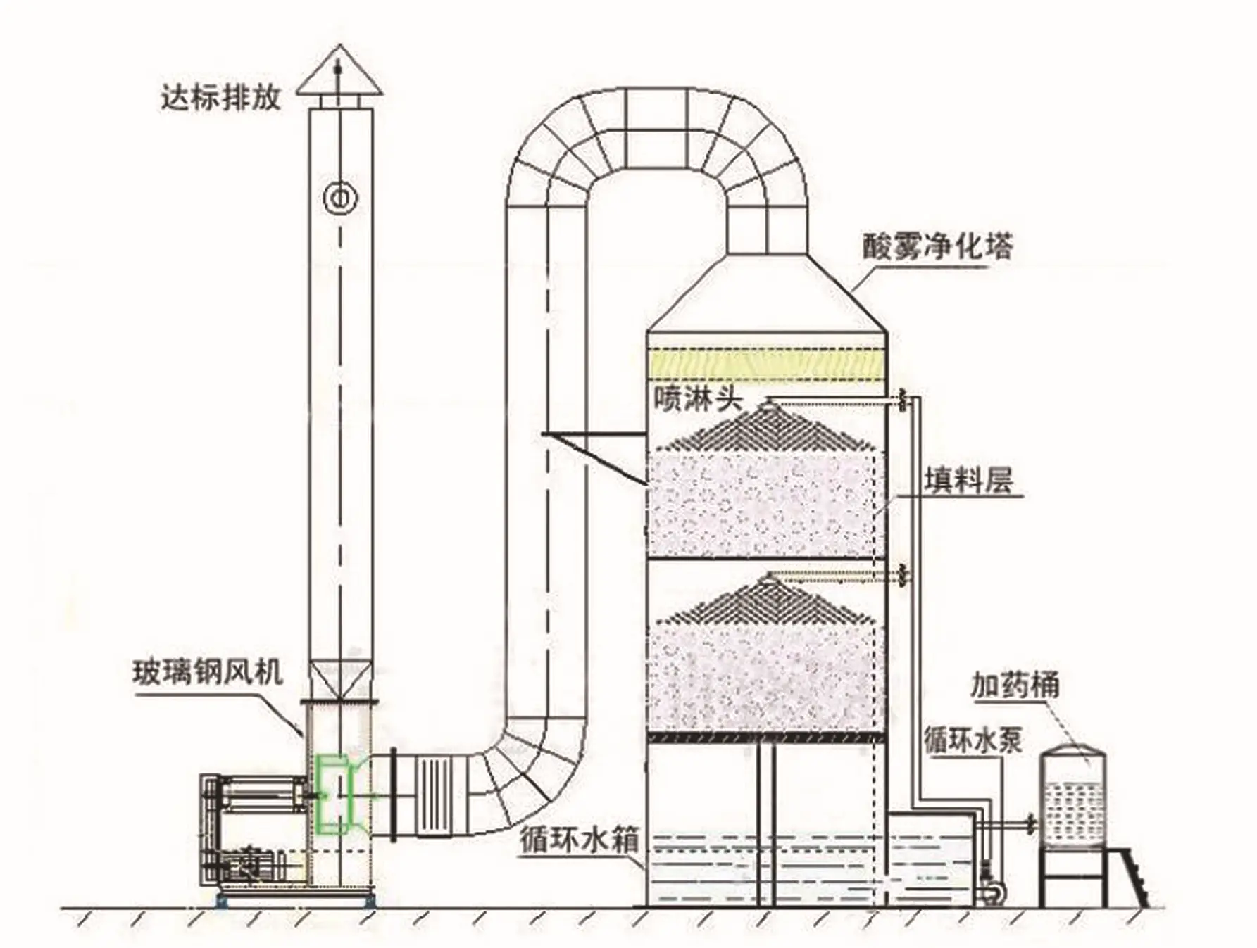 噴淋塔為實施噴淋法治理廢氣或回收原料的重要組成設備,故又稱為水洗塔、洗滌塔、凈化塔。根據廢氣類別及噴淋液的不同可分為水噴淋塔、酸噴淋塔、堿噴淋塔、油噴淋塔、水膜除塵/濕式除塵器;按形狀也可分為立式洗滌塔、臥式洗滌塔;按材質又為分PP洗滌塔、玻璃鋼洗滌塔等。 噴淋塔運行方式是不斷將酸霧廢氣由風管引入凈化塔,將廢氣與氫氧化鈉吸收液進行充分接觸吸收中和反應,酸霧廢氣經過凈化后,再經除霧板脫水除霧后由風機排入大氣。吸收液在塔底經水泵增壓后在塔頂噴淋而下,之后回流至塔底水箱內如此進行循環使用。凈化后的酸霧廢氣可以達到地方排放標準的排放要求,也會低于國家排放標準。