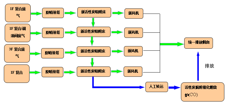 目前該公司在各車間根據(jù)不同的生產(chǎn)工藝分類收集廢氣匯入主風管,主風管接入指定廠房排風井,經(jīng)風井在離心風機的牽引作用下引入屋面廢氣治理設(shè)施,對于低濃度廢氣采用的是水噴淋吸收法,對于高濃度廢氣采用的是水噴淋吸收+活性炭吸附法,該公司為響應環(huán)保要求,擬對廢氣處理設(shè)施提標改造。