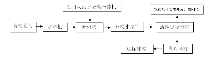 噴漆廢氣經廠風機抽引后進入水簾柜和噴淋塔,噴淋塔是一種效率高、壓力損失較低的除塵設備。噴淋塔內部有雙層旋流板和噴淋層,含塵氣體從側面切向進入,進入噴淋層和旋流板層,液滴、液膜通過慣性攔、擴散等效應初步攔截,之后穿過與水形成水膜,水膜粘附捕獲塵粒,氣流經過干式過濾器用于過濾小量的水汽和顆粒物。最后進入到活性炭吸附器,吸附掉廢氣中殘留部分的甲苯等有機物。經活性炭吸附處理后的氣體可達標排放。