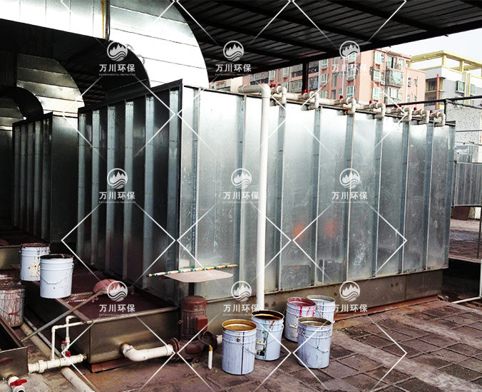 均勻安裝多層濕簾層和過濾層。水性過濾棉,不吸水,漆粉附著表面時(shí),會(huì)隨水流受重力作用被洗滌至循環(huán)水池,不易堵。濕簾層經(jīng)水洗后會(huì)在面上形成一層水膜,漆粉經(jīng)過該層被水膜黏附,對降低氣體流速,加長廢氣在噴淋塔的洗滌時(shí)間有重要作用。廢氣經(jīng)過除霧層(即氣水分離)后,再進(jìn)行活性炭吸附塔吸附。該法具有處理效果高,運(yùn)行穩(wěn)定優(yōu)點(diǎn)。