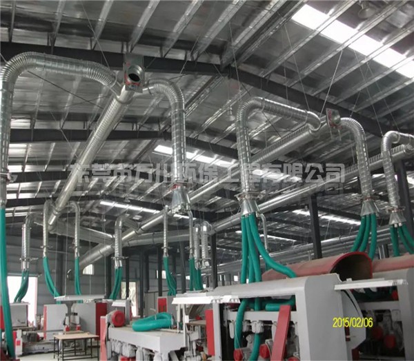 該系統(tǒng)的風(fēng)管為不銹鋼材質(zhì),法蘭連接,部分風(fēng)管架空在生產(chǎn)機(jī)器上方。